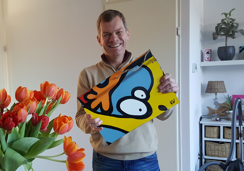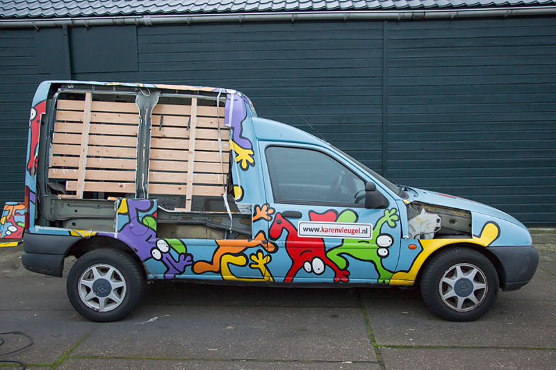In 2016 beschilderde ik mijn 2e auto. De eerste auto hebben we in stukken gezaagd en verkocht aan vrienden en kennissen. Op de achterkant is precies te zien welk deel het was van de auto. Naast de auto heb ik ook nog bijpassende bakfiets beschilderd, waar vrienden hun kinderen mee rondrijden. De bakfiets is door mijn vader ooit voor mijn zus en nichtjes in elkaar gelast van een oude opoefiets. Onderin is een filmpje te zien hoe ik de eerste auto beschilderd heb.