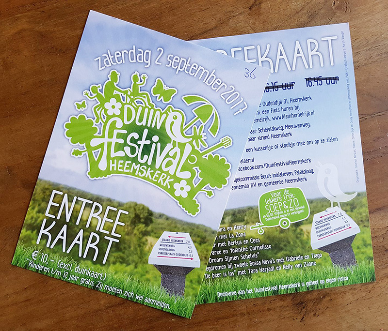 Voor Duinfestival Heemskerk heb ik een logo ontwikkeld, flyer/poster en een toegangskaartje ontworpen.