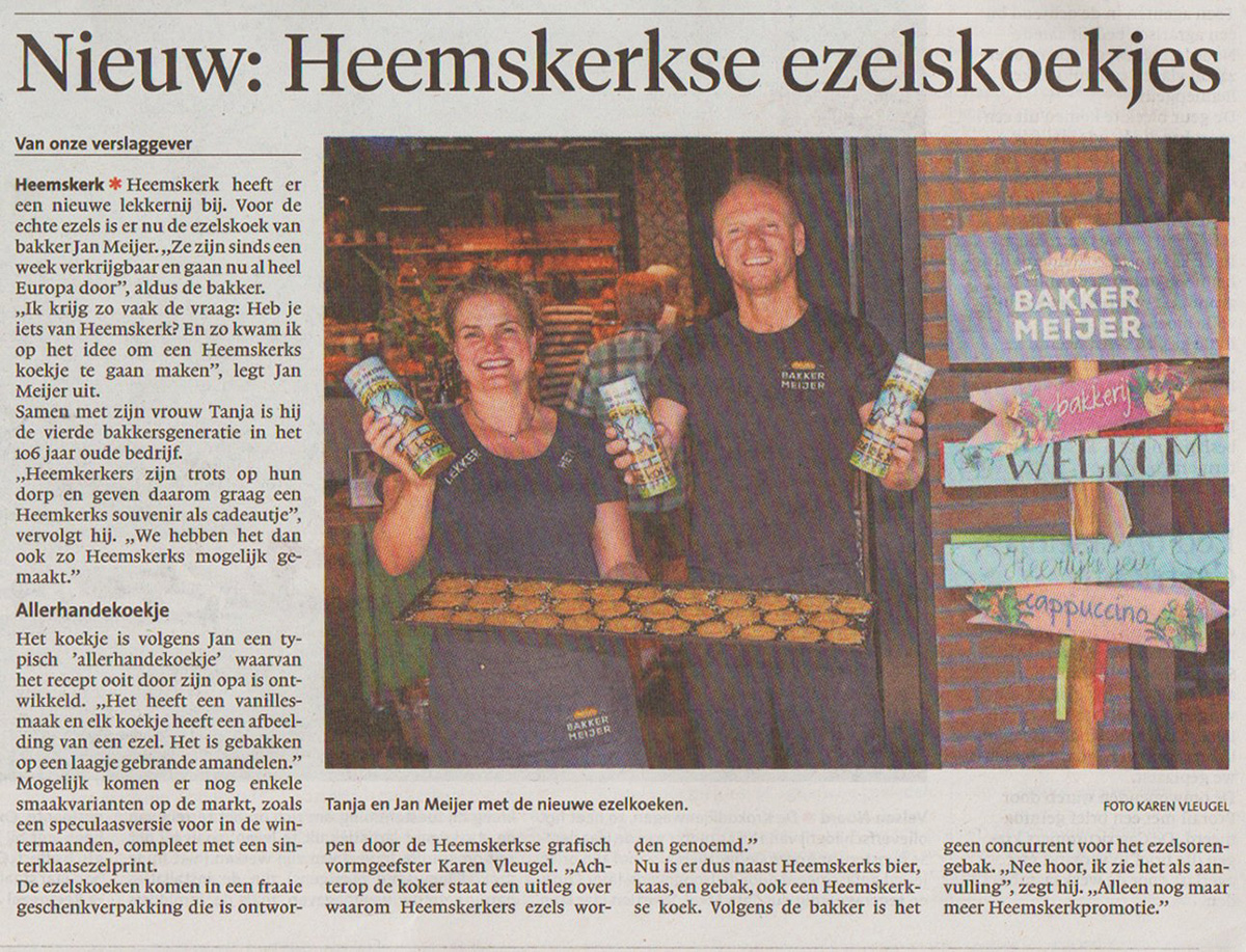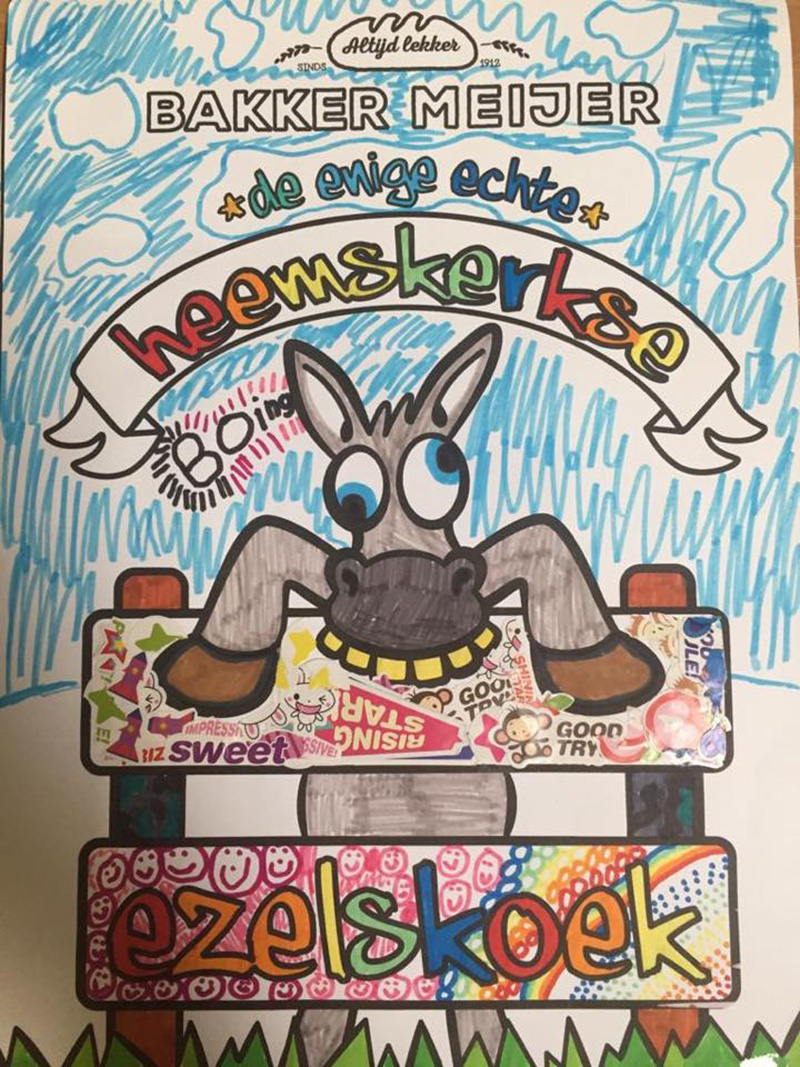 Voor de Heemskerkse Bakker Meijer ontwierp en illustreerde/ontwierp ik een etiket voor Heemskerkse Ezelskoeken. Heemskerkers worden namelijk ook wel ezels genoemd. Het hoofd van de ezel is gebruikt om een koekpreeg van te maken. Daarna maakte ik er nog een kleurplaat van, want bij de lancering is ook een kleurplaatwedstrijd georganiseerd.