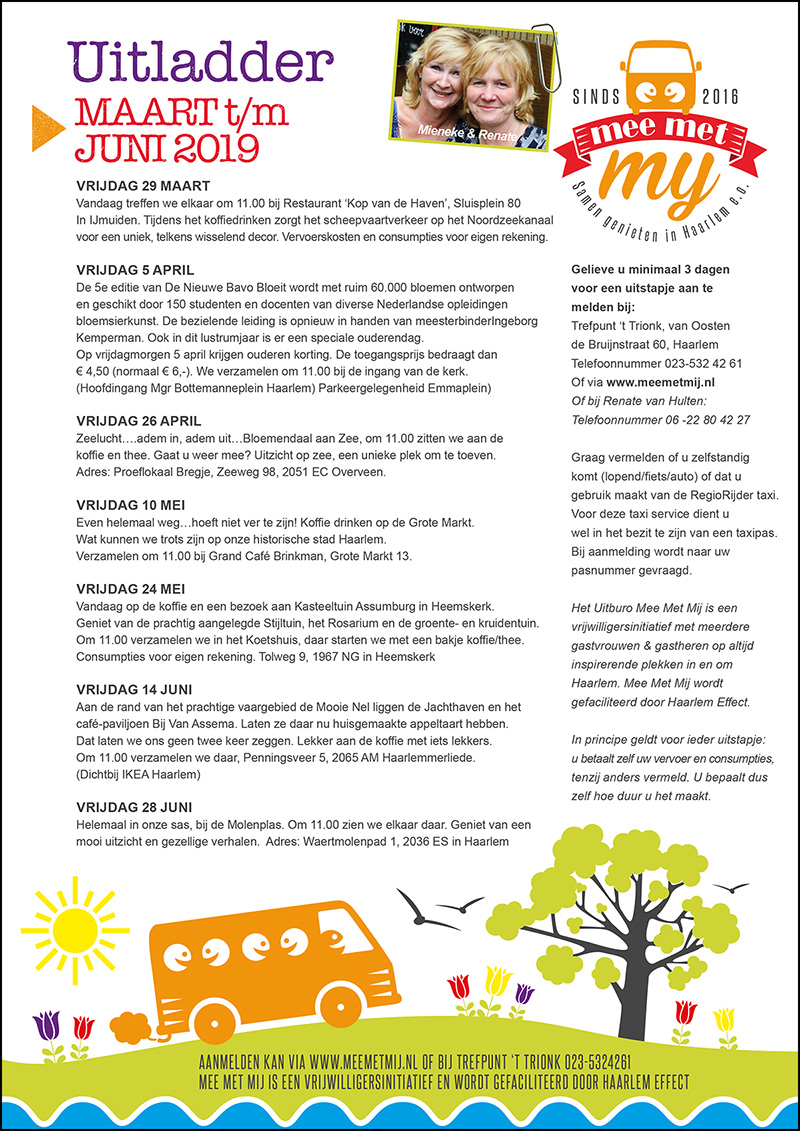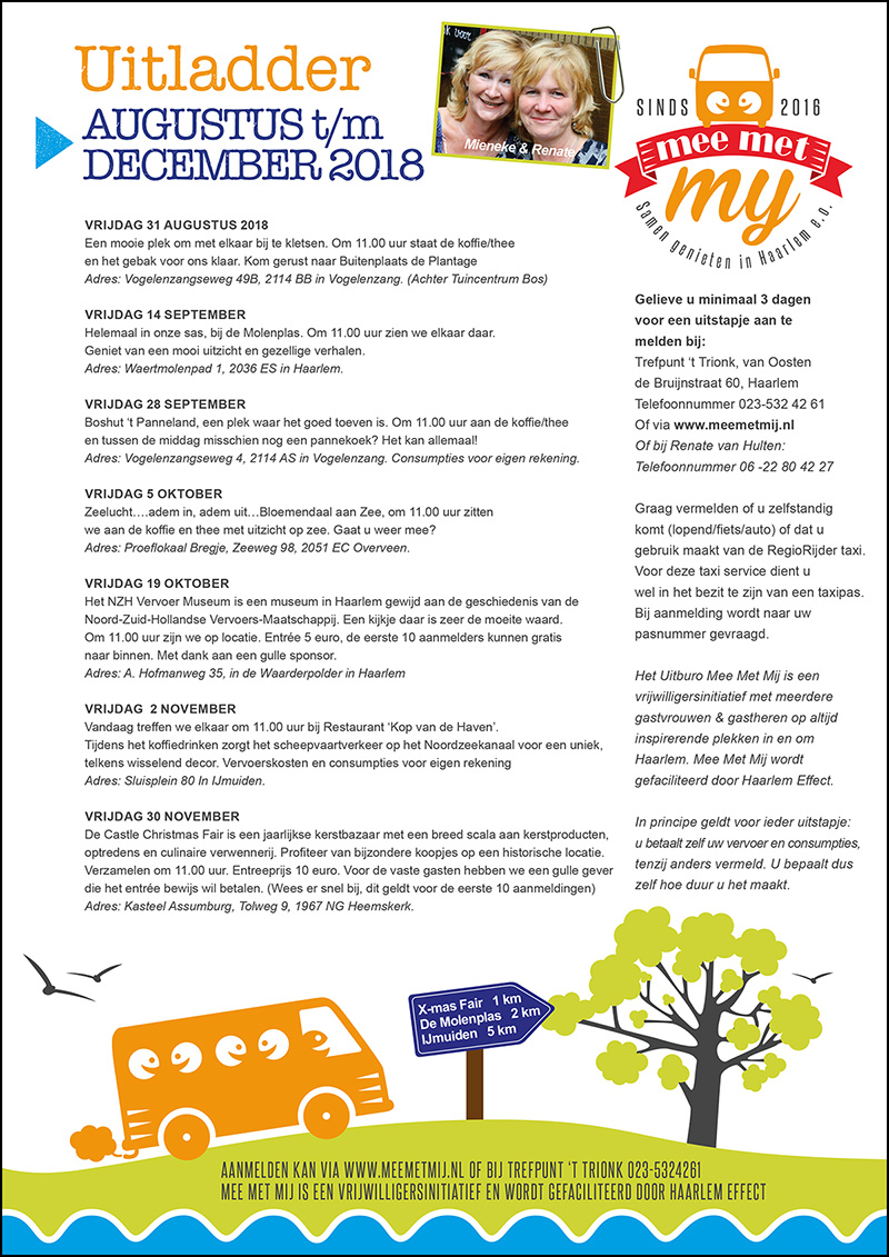 Mee Met Mij organiseert uitjes voor ouderen in de omgeving van Haarlem. Ik heb er een logo, visitekaartje en een nieuwsbrief voor ontworpen.