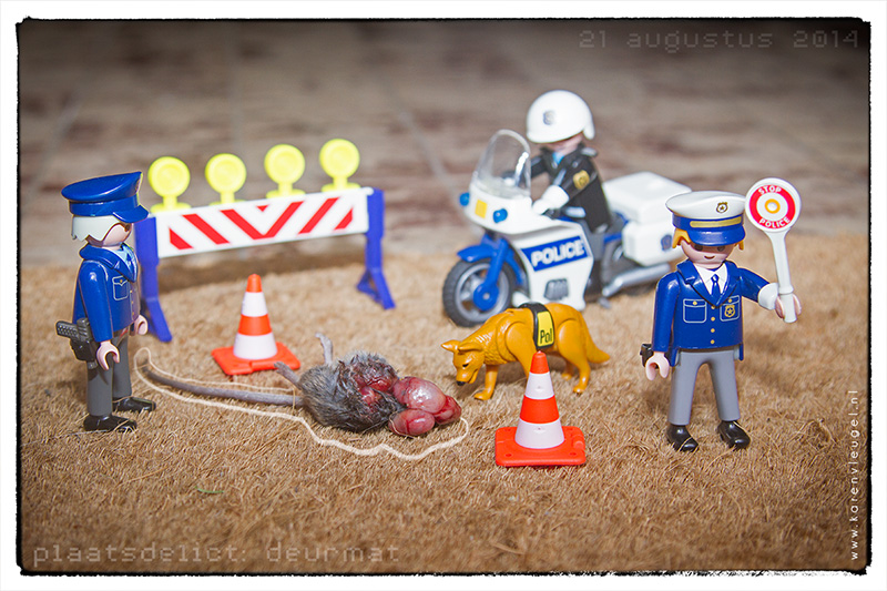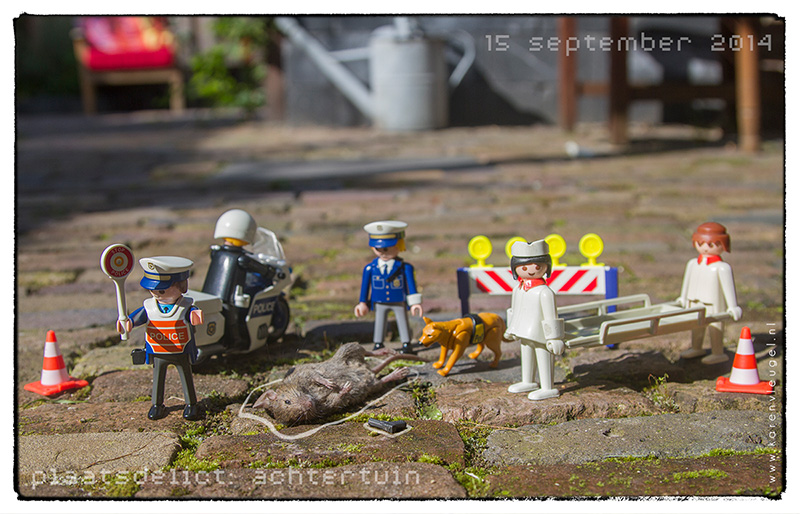 Met playmobil maak ik sinds 2014 plaatsdelictfoto’s van de slachtoffers van mijn katten. In 2017 verzamelde Vroege Vogels waarnemingen van dode muizen om in kaart te brengen waar welke muissoort voorkwam. Ik stuurde ook een aantal foto’s in. Waarna Vroege Vogels opnames kwam maken van de kat. De onderstaande plaatsdelictfoto’s zijn door meerdere katten gevangen. Op dit moment heb ik 2 katten, meneer De Bruin en mevrouw De Wit. NB: dit is niet zielig, zo is de natuur van een kat en het meeste wordt opgegeten.