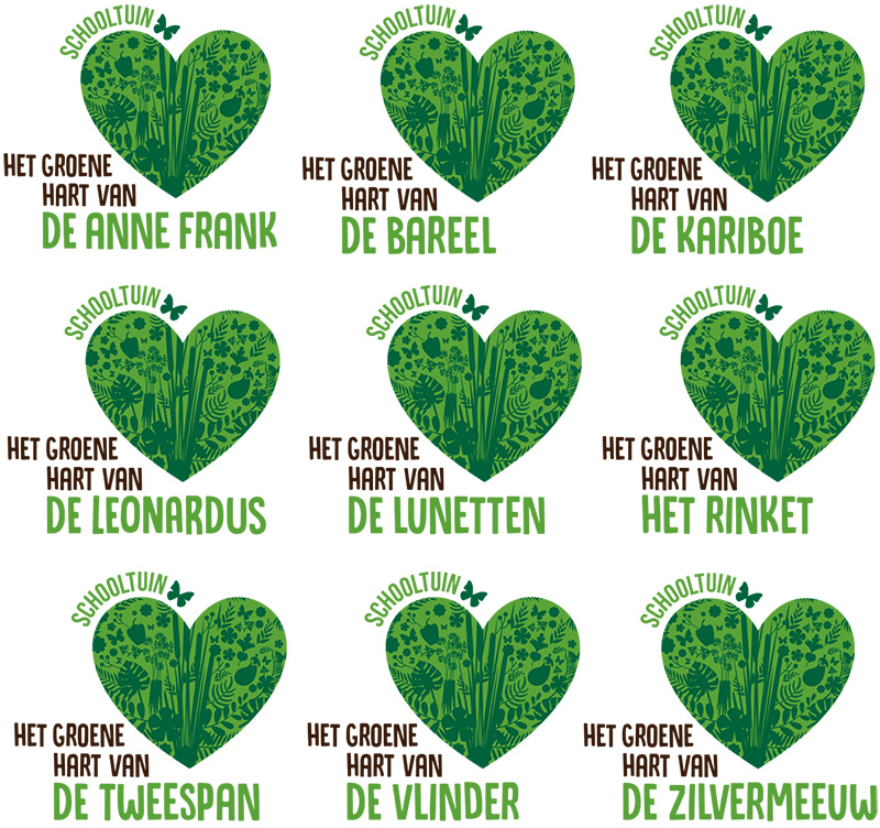 Het Groene Hart van de Schooltuinen leert basisscholen over tuin en natuur. Elke school heeft een moestuin, die wordt bijgehouden door de kinderen en de plantopa’s. Ik heb hiervoor een logo gemaakt, die aangepast kan worden naar de naam van de school.